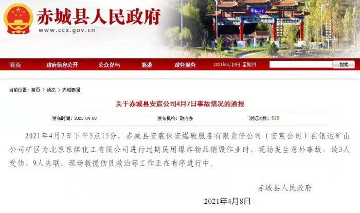 4月7日下午5點15分,赤城縣某爆破公司在銀達(dá)礦山公司礦區(qū)為北京某化工公司進(jìn)行過期民用爆炸物品銷毀作業(yè)時,現(xiàn)場發(fā)生意外事故,致3人受傷、9人失聯(lián)。