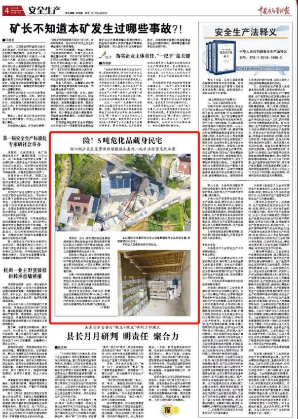 10月14日,《中國應急管理報》第4版刊發(fā)報道《險!5噸;凡厣砻裾 浙江桐廬縣應急管理局順藤摸瓜查處一起非法經營;钒浮芬晃。全文如下: 2021年10月14日,浙江桐廬縣應急管理局根據日常執(zhí)法檢查中發(fā)現的線索對轄區(qū)內某化工有限公司開展突擊檢查,發(fā)現該公司所在民宅的輔房內存放槍水、55%工業(yè)氫氟酸等危化品共5噸。 經執(zhí)法人員查實,該公司未取得危險化學品經營許可證,且該儲存場所安全條件不符合《危險化學品經營企業(yè)安全技術基本要求》的規(guī)定,一旦發(fā)生事故,將可能導致廠區(qū)及周邊居民區(qū)200余人中毒的嚴重后果。 為第一時間消除隱患,保障周圍居民的安全,桐廬縣應急管理局當晚就對該批危險化學品依法進行扣押并轉移至安全場所。次日,該局以涉嫌非法經營危險化學品對涉事企業(yè)立案調查。 通過多次走訪取證、專家論證,涉事企業(yè)因涉嫌違反《刑法》第134條之一第三項的規(guī)定,該案被桐廬縣應急管理局根據行刑銜接工作機制移送公安機關,后公安機關以涉嫌危險作業(yè)罪進行立案偵查。