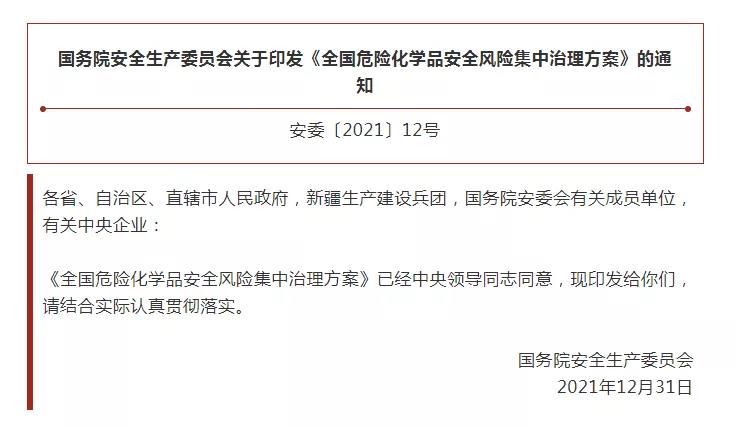 全國危險化學(xué)品安全風險集中治理方案 危險化學(xué)品涉及行業(yè)領(lǐng)域廣、鏈條長,安全風險大、治理任務(wù)重。黨中央、國務(wù)院高度重視,習近平總書記多次作出重要批示,最近又專門作出重要指示。為認真抓好貫徹落實,有效防范化解危險化學(xué)品重大安全風險,保障人民群眾生命財產(chǎn)安全和社會穩(wěn)定,按照黨中央、國務(wù)院領(lǐng)導(dǎo)同志批示要求,結(jié)合深入貫徹落實中共中央辦公廳、國務(wù)院辦公廳《關(guān)于全面加強危險化學(xué)品安全生產(chǎn)工作的意見》(以下簡稱兩辦《意見》)和國務(wù)院安委會《全國安全生產(chǎn)專項整治三年行動計劃》(以下簡稱《三年行動計劃》),制定本方案。 一、總體要求 以習近平新時代中國特色社會主義思想為指導(dǎo),深入貫徹習近平總書記關(guān)于安全生產(chǎn)重要論述,堅持人民至上、生命至上,強化底線思維和紅線意識,統(tǒng)籌好發(fā)展和安全,深入分析研判、緊緊扭住抓牢貫徹落實兩辦《意見》和《三年行動計劃》過程中發(fā)現(xiàn)的突出矛盾以及國內(nèi)外典型事故暴露出的重大風險隱患,全面調(diào)動各方力量,利用一年時間集中治理,進一步推動各地區(qū)、各有關(guān)部門和單位樹牢安全發(fā)展理念,加大安全投入,壓實安全責任,堅持嚴格監(jiān)管執(zhí)法與強化信息技術(shù)支撐并重,完善危險化學(xué)品安全風險防范化解工作機制,務(wù)必做到重大風險隱患排查見底、防范治理措施落實到位,真正從根本上消除事故隱患、從根本上解決問題,切實把確保人民生命安全放在第一位落到實處,堅決防范遏制危險化學(xué)品重特大事故,為迎接黨的二十大勝利召開營造安全穩(wěn)定環(huán)境。 二、重點治理的突出問題和重大安全風險 各地區(qū)、各有關(guān)部門和單位要認真梳理兩辦《意見》和《三年行動計劃》重點任務(wù)落實情況,深刻吸取典型事故教訓(xùn),采取有針對性措施,對照以下兩大類突出問題和四個環(huán)節(jié)的重大安全風險進行重點排查。 (一)安全發(fā)展理念不牢問題。一是學(xué)習貫徹習近平總書記關(guān)于安全生產(chǎn)重要論述不深入不扎實,沒有分析研判本地區(qū)危險化學(xué)品重大安全風險,對新情況、新問題不了解、不掌握。二是沒有統(tǒng)籌好發(fā)展和安全兩件大事,只重發(fā)展不顧安全,在不具備條件的情況下盲目發(fā)展高危工藝的化工項目,淘汰落后生產(chǎn)能力、推動化工產(chǎn)業(yè)升級措施不力、進展遲緩。三是源頭治理不嚴不實,化工產(chǎn)業(yè)轉(zhuǎn)移安全風險在一些地區(qū)加速集聚,風險管控能力不足,導(dǎo)致事故多發(fā),近一年全國發(fā)生的12起化工較大事故中有7起發(fā)生在異地轉(zhuǎn)移企業(yè)。一些地區(qū)沒有對危險化學(xué)品企業(yè)全面開展安全分類整治,非法違法“小化工”整治不認真不徹底。四是安全投入不足,一些地區(qū)涉及“兩重點一重大”(重點監(jiān)管的危險化工工藝、重點監(jiān)管的危險化學(xué)品和危險化學(xué)品重大危險源)的化工企業(yè)沒有按期完成泄漏檢測報警、緊急切斷、自動化控制和安全儀表系統(tǒng)的裝備使用,自動消防設(shè)施功能失靈,消防基礎(chǔ)設(shè)施設(shè)備及管道老化。五是應(yīng)急處置力量不足,部分大型企業(yè)未按要求建設(shè)企業(yè)專職消防隊,部分企業(yè)沒有建設(shè)相關(guān)工藝處置隊和應(yīng)急處置隊。 (二)安全生產(chǎn)責任不落實問題。一是安全監(jiān)管執(zhí)法力量薄弱,一些危險化學(xué)品重點地區(qū)沒有按照兩辦《意見》要求配齊配強專業(yè)執(zhí)法力量,危險化學(xué)品安全監(jiān)管執(zhí)法人員中具有相關(guān)專業(yè)學(xué)歷、職業(yè)資格和實踐經(jīng)驗的不到三分之一,不懂不會的問題沒有得到根本改變。二是按照“三個必須”要求已經(jīng)明確的部門安全監(jiān)管責任落實不到位,甚至有的將自身的業(yè)務(wù)工作與安全割裂開來,安全風險因素考慮不足,導(dǎo)致漏管失控。三是一些企業(yè)安全生產(chǎn)和消防安全主體責任不落實,風險辨識和管控制度執(zhí)行不嚴,未按規(guī)定配備化工專業(yè)技術(shù)團隊、高風險崗位操作人員和消防控制室值班人員,安全責任落實不到基層班組,一些重大危險源包保責任人只掛名不履職,一些消防控制室值班人員未取得自動消防設(shè)施操作員證。四是信息化監(jiān)控手段嚴重滯后,一些化工園區(qū)和企業(yè)對重大危險源、重點場所、基礎(chǔ)設(shè)施等沒有建立完善的安全風險在線監(jiān)測預(yù)警系統(tǒng),相關(guān)部門之間存在數(shù)據(jù)壁壘和信息孤島,尚未建立貫通危險化學(xué)品全生命周期的信息化系統(tǒng),更未實現(xiàn)區(qū)域聯(lián)網(wǎng)。 (三)生產(chǎn)儲存環(huán)節(jié)重大安全風險。一是一些精細化工企業(yè)沒有按要求開展反應(yīng)安全風險評估,部分涉及高危工藝的生產(chǎn)裝置未實現(xiàn)全流程自動化控制,操作人員專業(yè)能力資質(zhì)不達標。二是高危工藝和特別管控危險化學(xué)品企業(yè)安全設(shè)計水平低,風險隱患排查治理不徹底,常態(tài)化風險管控機制缺失。三是一些化工企業(yè)老舊裝置數(shù)量多,壓力容器管道安全風險增大