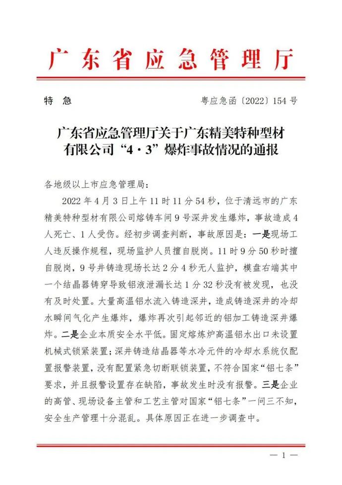 4月3日上午,廣東清遠某特種型材有限公司熔鑄二號車間9號鑄造井發(fā)生爆炸事故。事故造成4人死亡、1人重傷,廠房嚴重損毀。 監(jiān)控視頻顯示,爆炸現(xiàn)場升起數(shù)米高的“蘑菇云”。 4月5日,清遠市清城區(qū)應急管理局通報,經(jīng)現(xiàn)場初步判斷,直接原因為:鋁棒在拉鑄過程中,鋁水泄漏到冷卻水池內導致事故發(fā)生。 事故通報顯示,具體事故原因初步總結為: 一是現(xiàn)場工人違反操作規(guī)程,現(xiàn)場監(jiān)護人員擅自脫崗。 二是企業(yè)本質安全水平低。 三是企業(yè)的高管、現(xiàn)場設備主管和工藝主管對國家“鋁七條”一問三不知,安全生產(chǎn)管理十分混亂。 有關善后工作正在進行中,清遠已成立事故調查組,正開展事故調查處理工作。