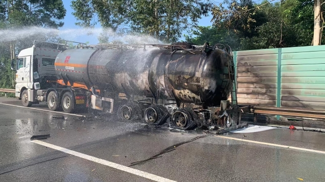 7月13,廣州花都區(qū)京港澳高速離北興收費站出口1公里處,一輛載有26噸廢酸水的槽罐車輪胎突然起火。