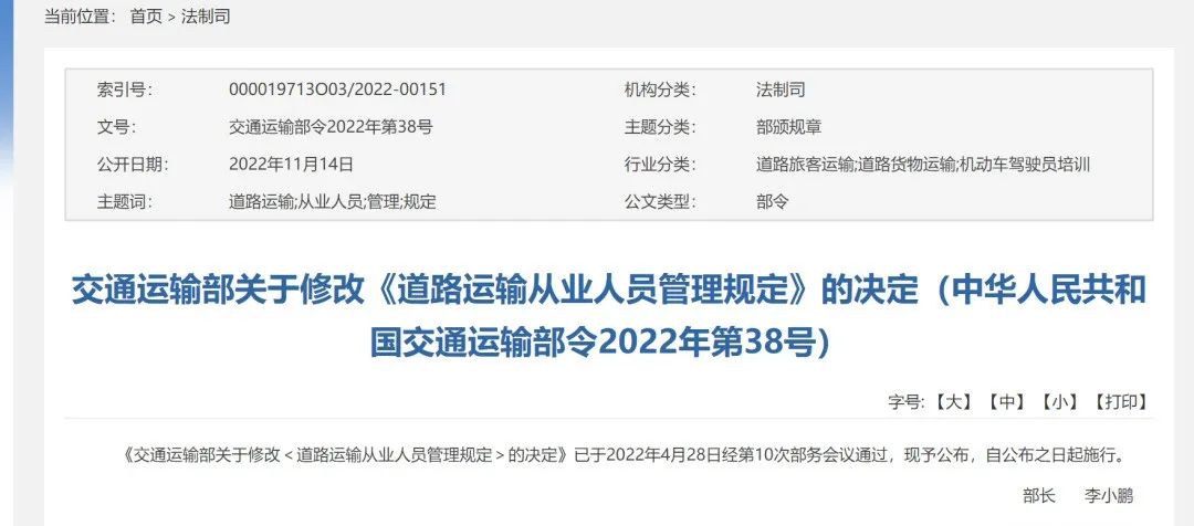 近日,交通運輸部公布了《關(guān)于修改〈道路運輸從業(yè)人員管理規(guī)定〉的決定》,新規(guī)自公布之日起實施。
