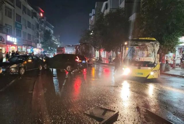 事發(fā)現(xiàn)場(chǎng)視頻畫面顯示,夜幕下,正下著雨,一輛車頭受損的公交車斜停在路中間,旁邊是一輛車尾已出現(xiàn)變形的油罐車,中間還有兩輛不同程度碰撞受損的私家車,現(xiàn)場(chǎng)散落著不少玻璃和零件碎片,引起了群眾圍觀,隨后有救護(hù)車到場(chǎng)。