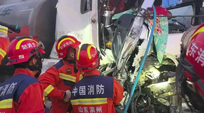 5月15日3時49分,山東濱州市消防救援支隊指揮中心接到報警稱,沾化區(qū)340國道徒駭河大橋紅綠燈附近發(fā)生一起車禍?zhǔn)鹿,兩人被困,接警后,沾化?jīng)濟開發(fā)區(qū)特勤消防救援站立即出動消防救援人員趕赴現(xiàn)場處置。消防救援人員到達現(xiàn)場后發(fā)現(xiàn),事故現(xiàn)場為一輛油罐車追尾一輛半掛車,油罐車駕駛室嚴重變形,車頭被擠扁,司機及押運人員分別被變形的操作臺壓住右腳和左腳,無法脫困。 了解情況后,指揮員立即下達救援命令:警戒組與現(xiàn)場交警部門協(xié)同合作,對事故現(xiàn)場實施交通管制與引導(dǎo);救援組立即展開行動,決定破拆副駕駛室車門率先對押運人員實施救援,首先利用無齒鋸對車門鉸鏈進行切割,但鉸鏈為鑄鐵材質(zhì),一時難以割斷。 為節(jié)省救援時間,消防救援人員嘗試用拖車對油罐車駕駛室右側(cè)A柱進行拖拽牽引,無奈效果不明顯。隨后,消防救援人員再次使用液壓破拆工具組對副駕駛室車門進行破拆,車門被成功打開后,借助液壓擴張鉗不斷擴張押運人員左腳的被卡位置,增大救援空間,經(jīng)過1個多小時的緊張救援,押運人員被成功救出,交由現(xiàn)場等候的120醫(yī)護人員,送往醫(yī)院接受治療,同時,被困司機的右腳也拔了出來,自行由駕駛室車門脫困,現(xiàn)場交通恢復(fù)正常通行。事后,從被困司機處了解到,事發(fā)時霧太大,加之前車尾燈損壞不亮,導(dǎo)致在紅綠燈路口剎車不及造成追尾。